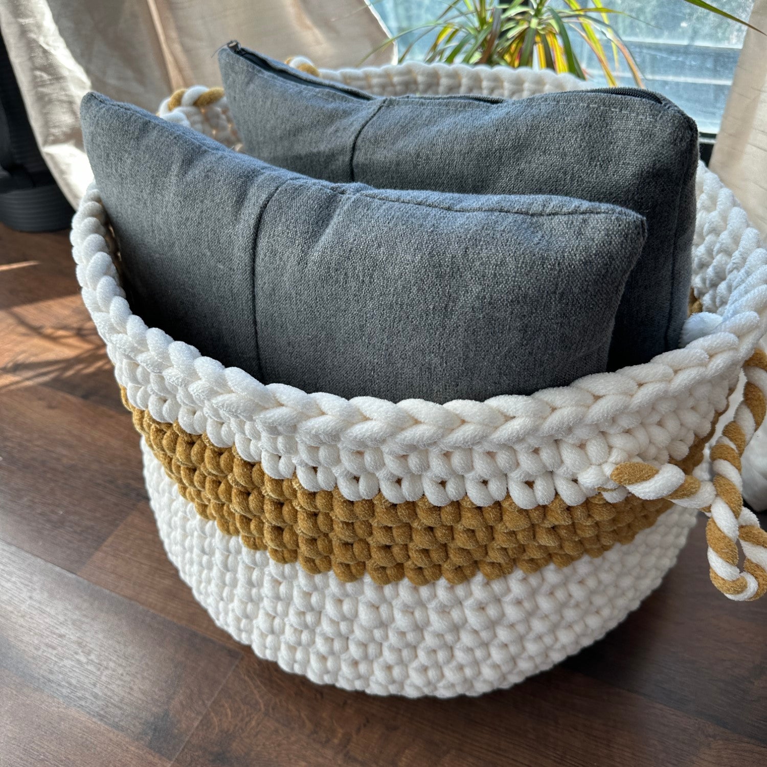 Transform your home with our Handmade Crochet Bernat Plush Big Giant Boujee Basket! Combining elegance with functionality, this luxurious basket is perfect for organizing and decorating. Ideal for storing blankets, pillows, toys, and more, its lightweight design and easy-to-carry handles make it a versatile addition to any room. Whether for yourself or as a gift, this stylish basket adds a touch of sophistication to any space.