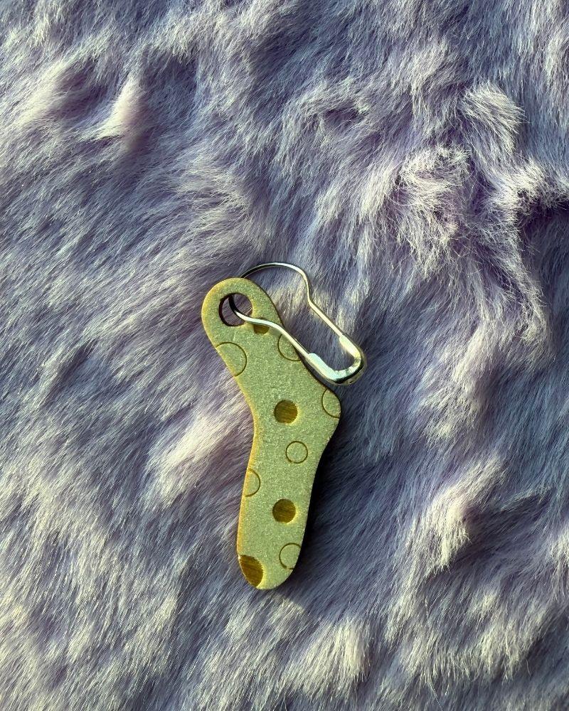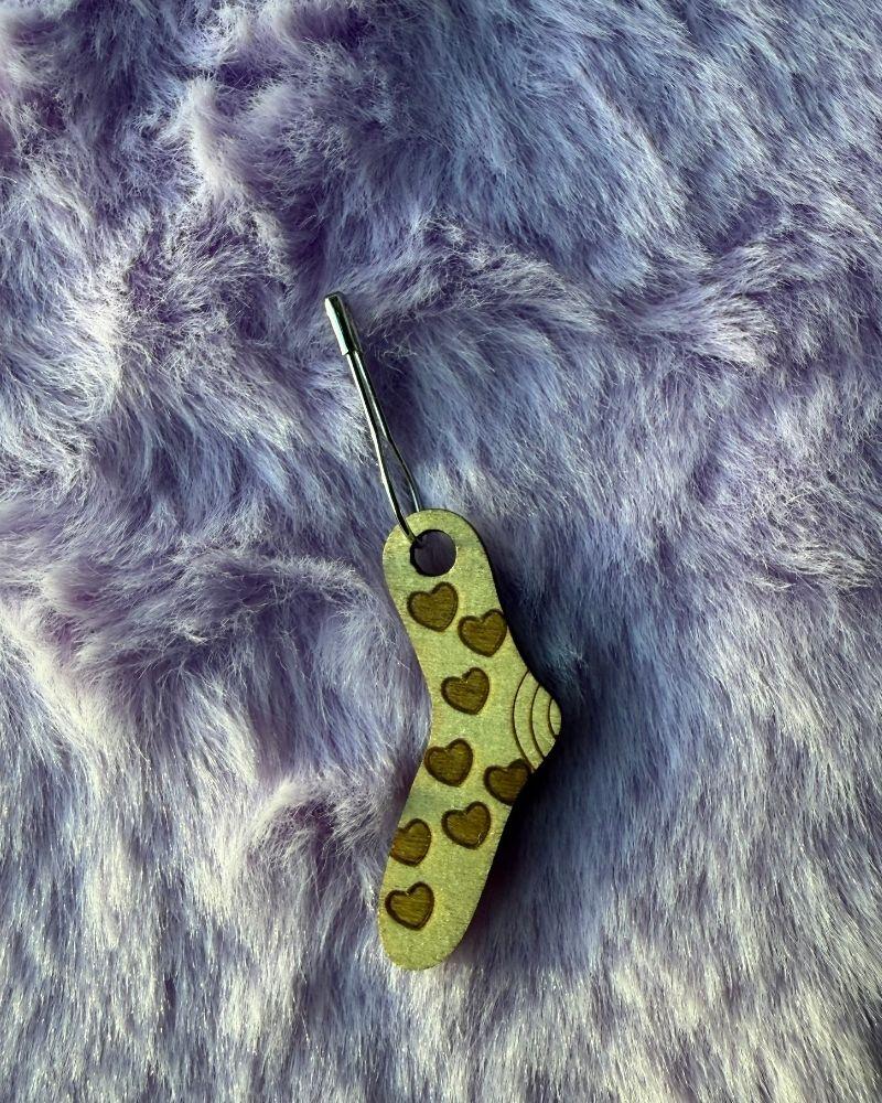 Crafted from lightweight, smooth wood, each marker features a tiny sock design — a sweet reminder of your love for cozy projects. The clasp hooks easily onto your work without snagging, making it ideal for marking rounds, increases, or pattern repeats.
